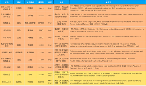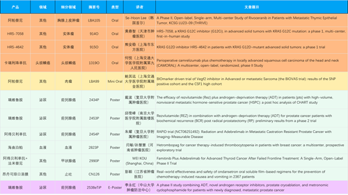 本届大会,作为中国医药创新代表性企业的恒瑞医药共有46项抗肿瘤领域研究成果入围,包括4项最新突破性摘要(LBA)1,共涉及14项创新药。其中9项入选口头(Oral)报告,2项入选简短口头报告(Mini Oral),32项研究接收为壁报(Poster),3项研究接收为电子壁报(E-Poster),覆盖食管胃癌、妇科肿瘤、肝癌、乳腺癌、胰腺癌、肺癌、肉瘤、胆道癌、头颈鳞癌、前列腺癌、甲状腺癌等十余个领域。14款创新药包括10款已上市产品:注射用瑞康曲妥珠单抗(艾维达®,研发代号:SHR-A1811)、注射用卡瑞利珠单抗(艾瑞卡®)、苹果酸法米替尼胶囊(艾比特®)、甲磺酸阿帕替尼片(艾坦®)、马来酸吡咯替尼片(艾瑞妮®)、阿得贝利单抗注射液(艾瑞利®)、羟乙磺酸达尔西利片(艾瑞康®)、氟唑帕利胶囊(艾瑞颐®)、瑞维鲁胺片(艾瑞恩®)、海曲泊帕乙醇胺片(恒曲®),以及4款未上市产品,包括KRASG12C抑制剂HRS-7058、KRASG12D抑制剂HRS-4642、抗PD-L1/TGF-βRII双抗瑞拉芙普-α注射液(SHR-1701)、Trop-2 ADC SHR-A1921。2类新药盐酸伊立替康脂质体注射液(II)(越优力®)及国内首仿药昂丹司琼口溶膜(艾其速®)各有1项研究入选。