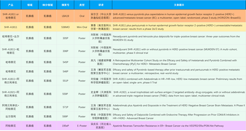 在乳腺癌领域,恒瑞创新产品相关研究共入选1项口头报告、1项简短口头报告、8项壁报和1项电子壁报,共11项研究。吡咯替尼、达尔西利、阿得贝利单抗、瑞康曲妥珠单抗等新老创新药物,均有多篇研究入选,展现出恒瑞医药在乳腺癌领域多年深耕的丰硕成果。
