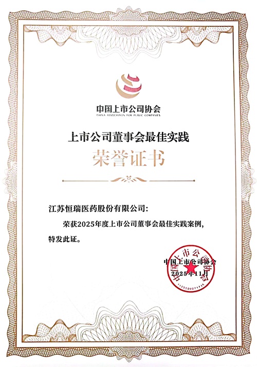 在中国上市公司协会组织的“2025上市公司董事会最佳实践案例征集活动”中,恒瑞医药从5000余家A股上市公司中脱颖而出,荣获“2025年上市公司董事会最佳实践案例”,充分彰显了监管机构和资本市场对公司董事会治理、信息披露、投资者关系管理等方面的认可。