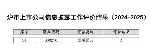 与此同时,在上海证券交易所公布的2024-2025年度沪市上市公司信息披露工作评价中,恒瑞医药再次荣获最高评级——A级。
