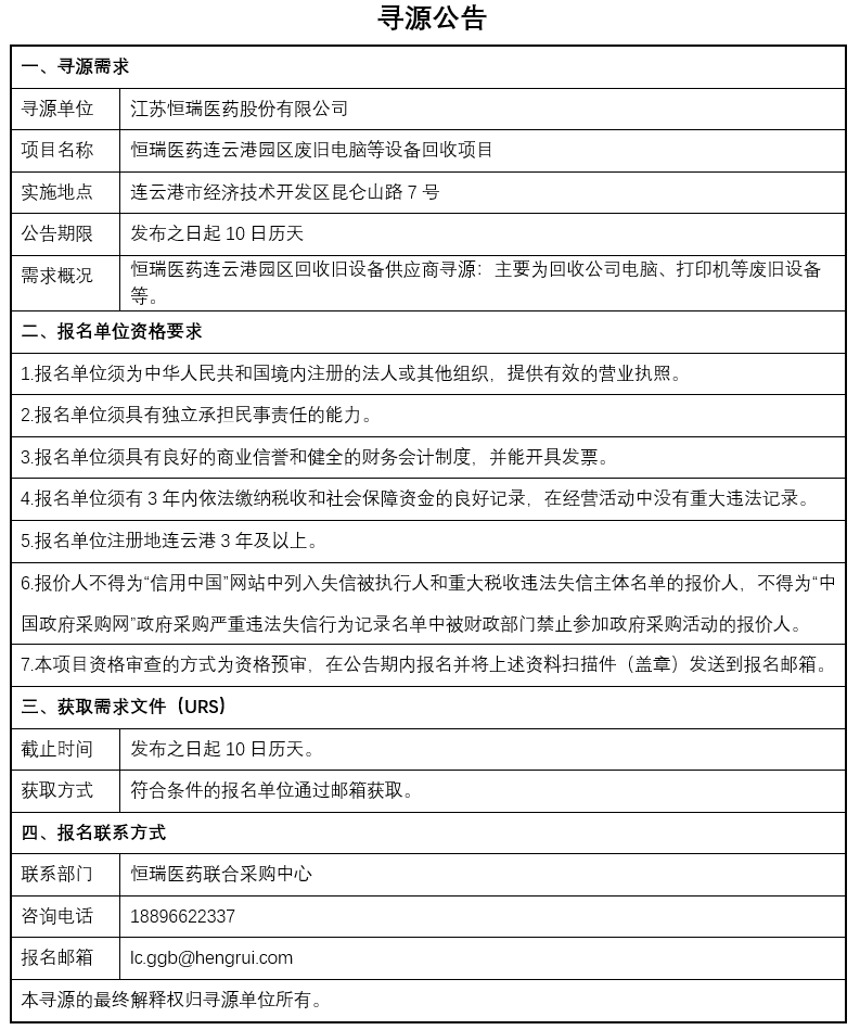 寻源公告-恒瑞医药连云港园区废旧电脑等设备回收项目