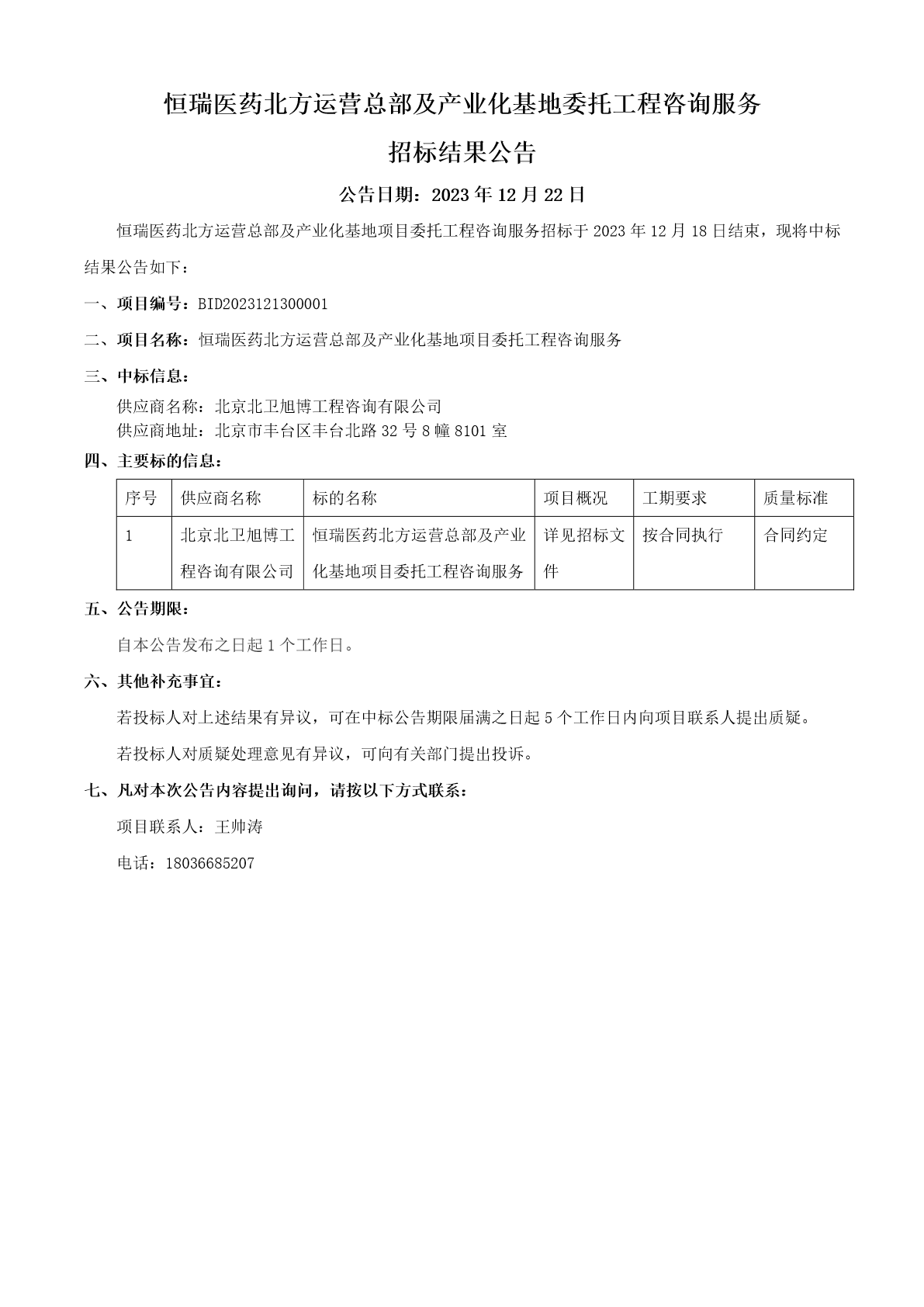 恒瑞医药北方运营总部及产业化基地委托工程咨询服务招标结果公告